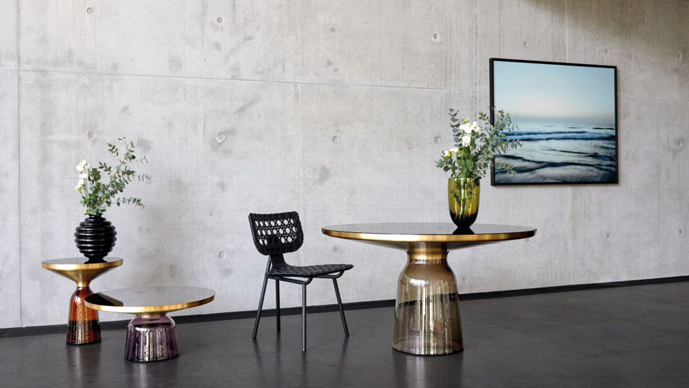 Beim Bell Table wird der Tischfuß jedoch zur prägnanten Glasform im Raum, auf dem ein Metallkörper auffliegt. Das Glas verhilft dem normalerweise schweren Metall so zu einer schwebenden Leichtigkeit. Der Bell Table ist in den unterschiedlichsten Versionen erhältlich.