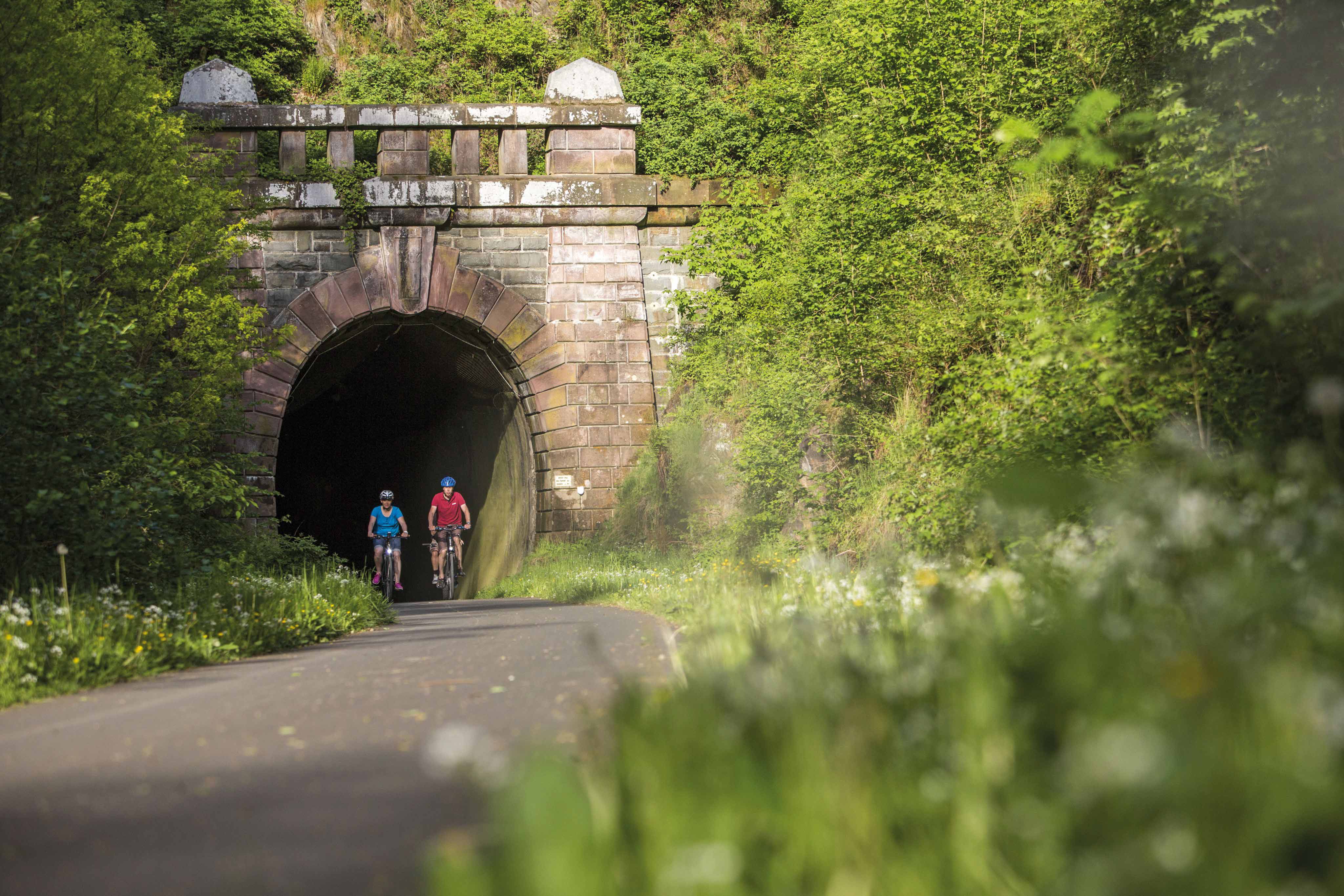 Gebaut Anfang des 20. Jahrhunderts galt der Eisenbahntunnel als längster in der damaligen Provinz Westfahlen. Die Eisenbahn fuhr von Olpe bis Rothemühle bereits seit 1880, das Teilstück von Freudenberg über Hohenhain entstand aber erst später. Erst 1983 wurde der Eisenbahnbetrieb hier eingestellt und die Gleise wurden zurückgebaut. Der örtliche Heimatverein kämpfte erfolgreich dagegen, dass der Tunnel anschließend einfach zugemauert wurde. Seit 2005 steht er nun auf der Denkmalliste der Stadt Freudenberg. Auf der ehemaligen Bahntrasse war nur Raum für einen Radweg, das letzte Teilstück, das sich bis Wildenburg-Bahnhof erstreckt, wurde vor 20 Jahren fertiggestellt. Damit war der insgesamt 60 Kilometer lange Sieg-Bigge-Radweg von Kirchen bis Freudenberg vollendet. Wer auf dem Fachwerkwanderweg „Wilder Mann“ unterwegs ist, kommt ebenfalls an diesem Tunnel vorbei.