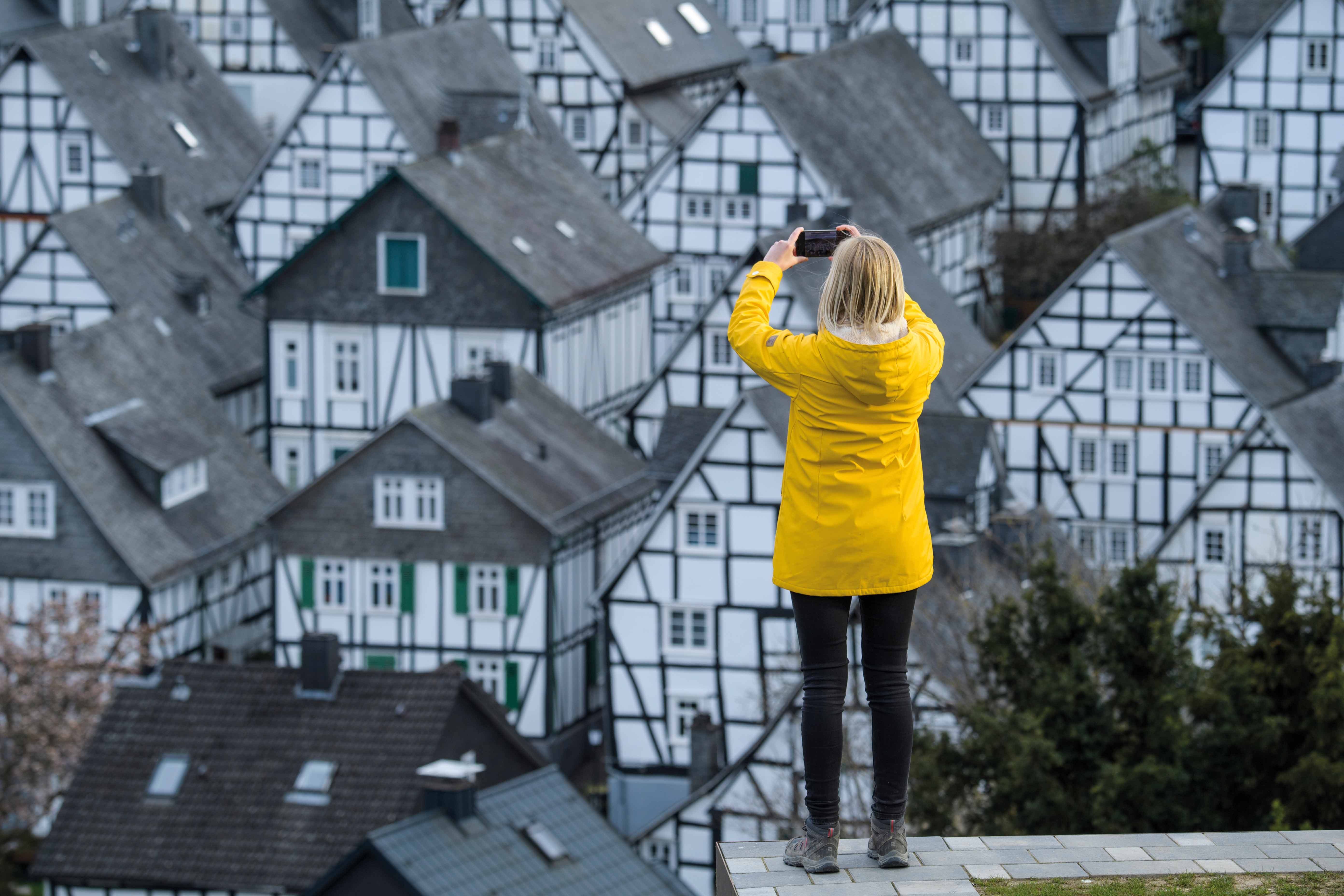 Wenn – so wie 1969 geschehen – einfach mal 17 Gemeinden im Rahmen einer kommunalen Gebietsreform zu einer Stadt fusioniert werden, ist man auf der Suche nach einem gemeinsamen Slogan. „Stadt mit Tradition und Zukunft“ war schließlich das offizielle Motto des neu entstandenen Freudenberg. Vor ziemlich genau zehn Jahren gab es dann eine weitere Zusammenführung: der Verkehrsverein Luftkurort Freudenberg und die Freudenberger Werbegemeinschaft wollten mit gemeinsamen Initiativen Wirtschaft, Kultur und Tourismus koordiniert nach vorne bringen. Aber wie wirkt Freudenberg denn eigentlich, zum Beispiel, wenn man es von oben betrachtet? Die hübschen, schwarz-weißen Fachwerkhäuser mit ihren spitzen Giebeln sehen nicht nur so aus wie etwas, was man in der Form noch nie gesehen hat. Nein, sie sind auch einzigartig in Deutschland. Über 80 dicht gereihte, einheitliche Fachwerkhäuser in parallelen Straßenreihen gibt es sonst nirgendwo. Das beinahe geschlossene Ensemble ist mitten im alten Ortskern, der auch „Alter Flecken“ genannt wird. Schon zum zweiten Mal war die damalige Stadt im 17. Jahrhundert abgebrannt. Dass die Häuser danach genau in dieser Form wieder aufgebaut wurden, hatte sowohl praktische als auch politische Gründe. Fürst Johann Moritz von Nassau-Siegen ordnete diese Bauweise an. Es ging ja darum, die Stadt schnell und kostengünstig wieder herzustellen. Das waldreiche Siegerland bot reichlich Bauholz und die neuen Häuser wurden zum Teil auf den erhaltenen Grundmauern und Kellern von 1540 erreichtet. Dadurch, dass das bestehende Straßengerüst mit parallelen Reihen und giebelständigen Häusern beibehalten wurde, schaffte man außerdem eine geordnete und damit verteidigungsfähige Struktur. Schöner Nebeneffekt für den Landesherrn: Das repräsentative Gesamterscheinungsbild symbolisierte seine Herrschaft und stärkte die innerdörfliche Gemeinschaft. Wie wirkt Freudenberg denn sonst noch auf Außenstehende? Vielleicht ein kleines bisschen lustig. „Ich wohne in Freudenberg-Oberholzklau“ können Menschen sagen, die hier zuhause sind. Der zweite älteste Stadtteil heißt dementsprechend „Niederholzklau“: Klingt ungewöhnlich, ist aber in Freudenberg ganz normal.