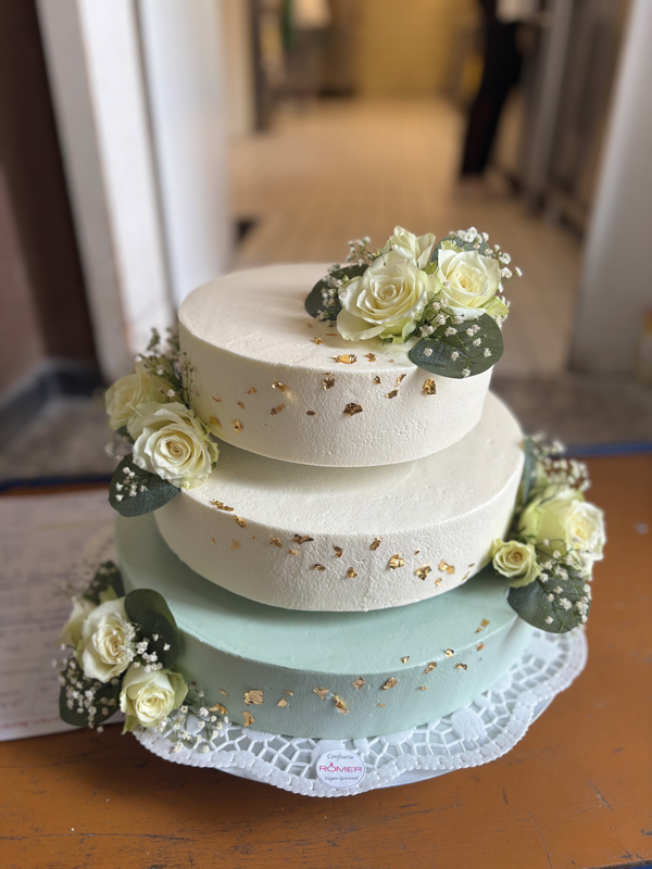 Sie sind optische Kunstwerke und sie schmeicheln dem Gaumen. Hochzeitstorten aus dem Café Römer werden traditionell von Hand gefertigt und frisch hergestellt. Konditormeister Tim Nockemann führt das Hotel-Café-Konditorei Römer bereits in vierter Generation, gemeinsam mit seiner Ehefrau und seiner Mutter. Er setzt auf erlesene Zutaten: „Wir verzichten auf sämtliche Konservierungsstoffe und Aromen und nutzen für unsere Fruchtfüllungen ausschließlich hochwertiges Fruchtpüree. Fruchtpasten oder Fertigmischungen verwenden wir gar nicht. Das Marzipan beziehen wir von der Firma Lubeca aus Lübeck. Mit seinem besonders hohen Mandelanteil verfügt es über einen sehr intensiven Geschmack und darf gemäß den erfüllten Qualitätsanforderungen als ‚Lübecker Marzipan‘ bezeichnet werden“, so Nockemann. Auf Wunsch liefert die Konditorei die Torte auch direkt zur Hochzeitsfeier.