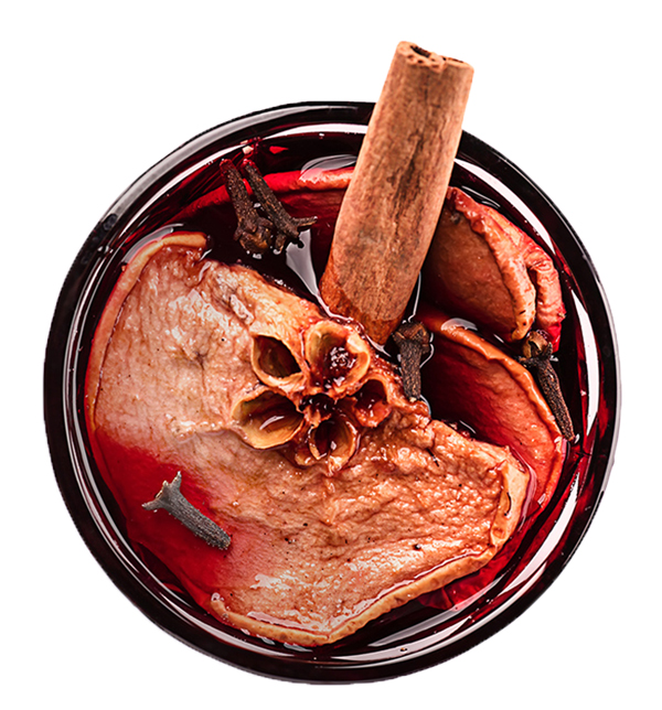 125 ml Rotwein (z.B. Spätburgunder), 30 ml Orangensaft, 1 Zimtstange, 2-3 Nelken, 1 Sternanis, 1 Zitrone (in Scheiben geschnitten), 30 g Zuckerhut (Feuerzucker), 30-40 ml Rum (mit mindestens 54% Alkoholgehalt)